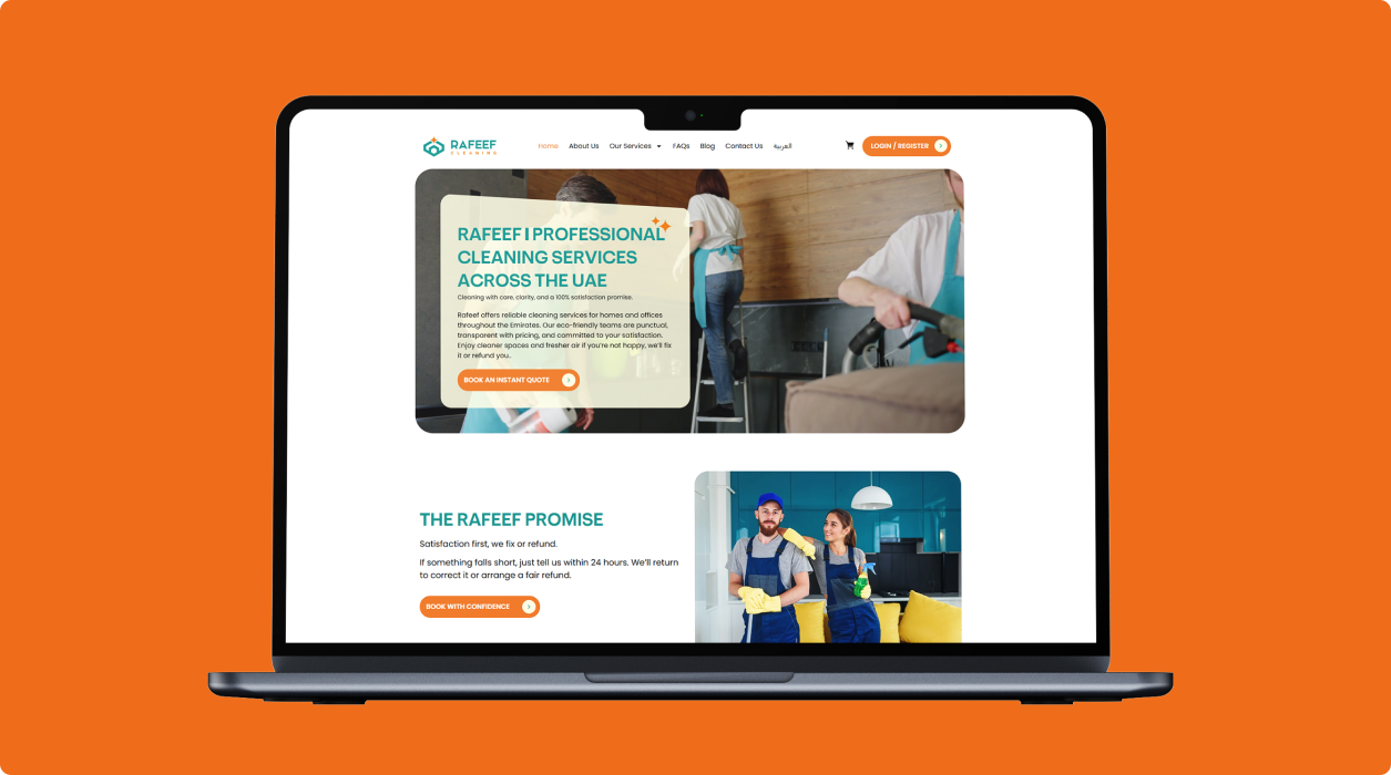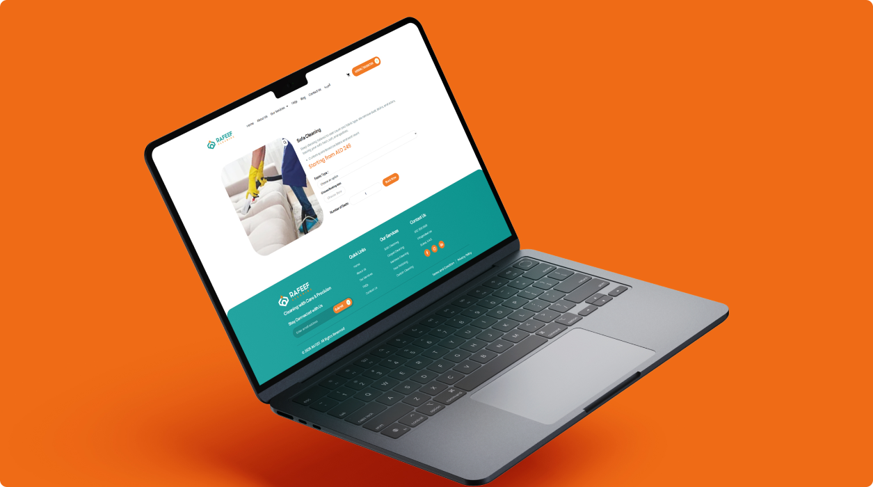 تم تطوير رفيف كمنصّة حجز خدمات ثنائية اللغة وموجّهة للهواتف أولاً، ومخصّصة لسوق الإمارات. هدف المشروع تبسيط حجز خدمات تنظيف المنازل عبر ميزات مثل التسعير اللحظي، والدفع الفوري، والجدولة السلسة. بُنيت المنصّة على ووردبريس مع لوحة إدارة مخصّصة، لتجمع بين القابلية للتوسّع وسهولة الإدارة، مع تقديم هوية علامة حديثة وموثوقة.